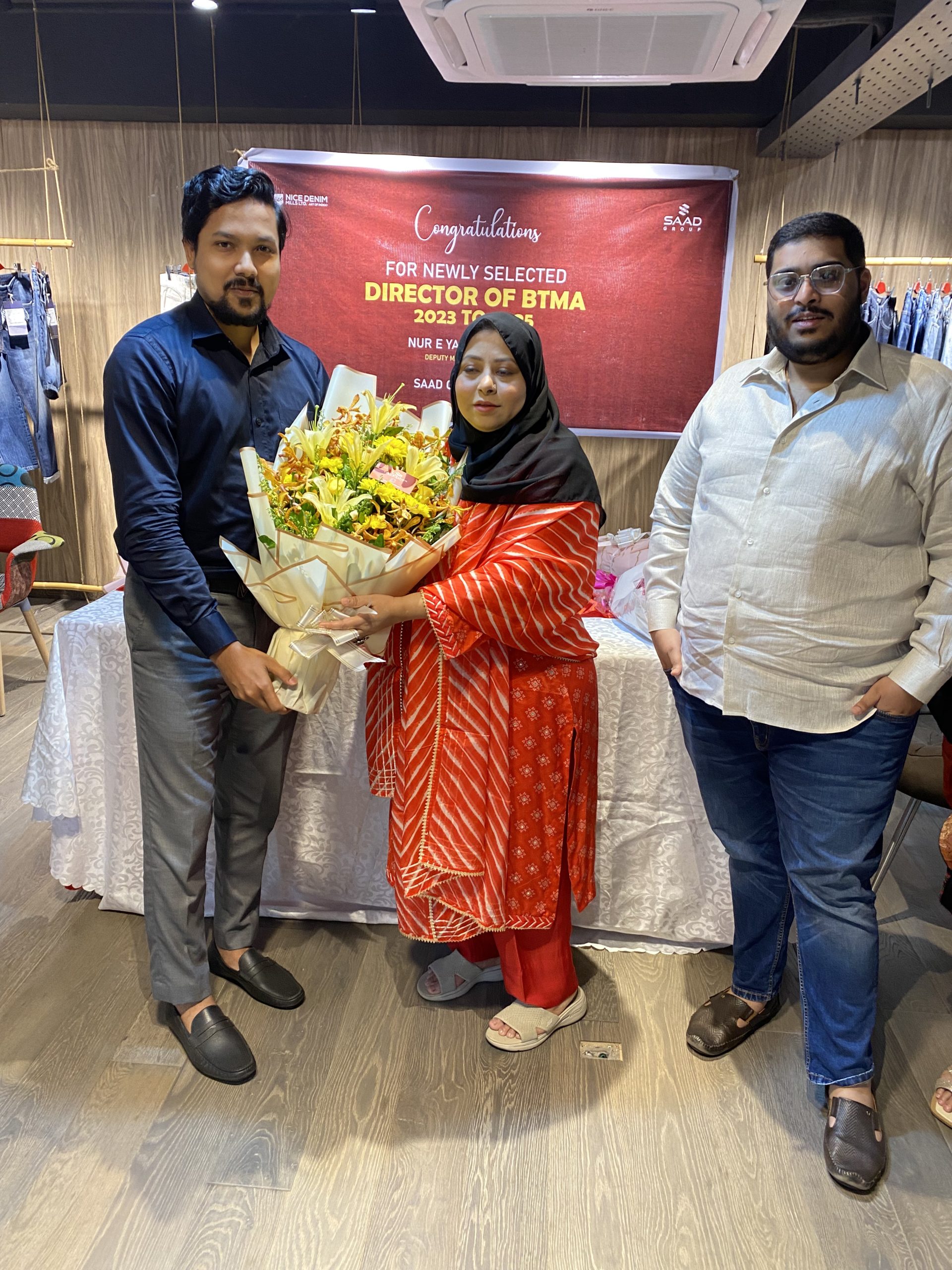 Saad Group Industries ve Nice Denim Mills Ltd (Noman Group’un kardeş kuruluşu) Yönetim Kurulu üyelerinden Sayın Nur-E-Yasmin Fatima. 2023-2025 dönemi için BTMEA (Bangladeş Konfeksiyon Üreticileri ve İhracatçıları Birliği) Direktörü olarak seçilmiştir. USB Certification Bangladeş Ülke Müdürü Hasnat Kabir, USB Certification adına kendisini tebrik etmek üzere programa katıldı.
